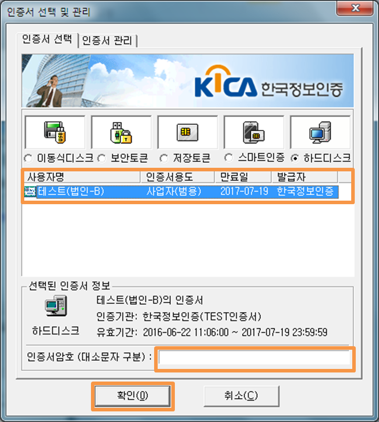 인증서 암호를 입력 후 "확인" 버튼을 클릭합니다.